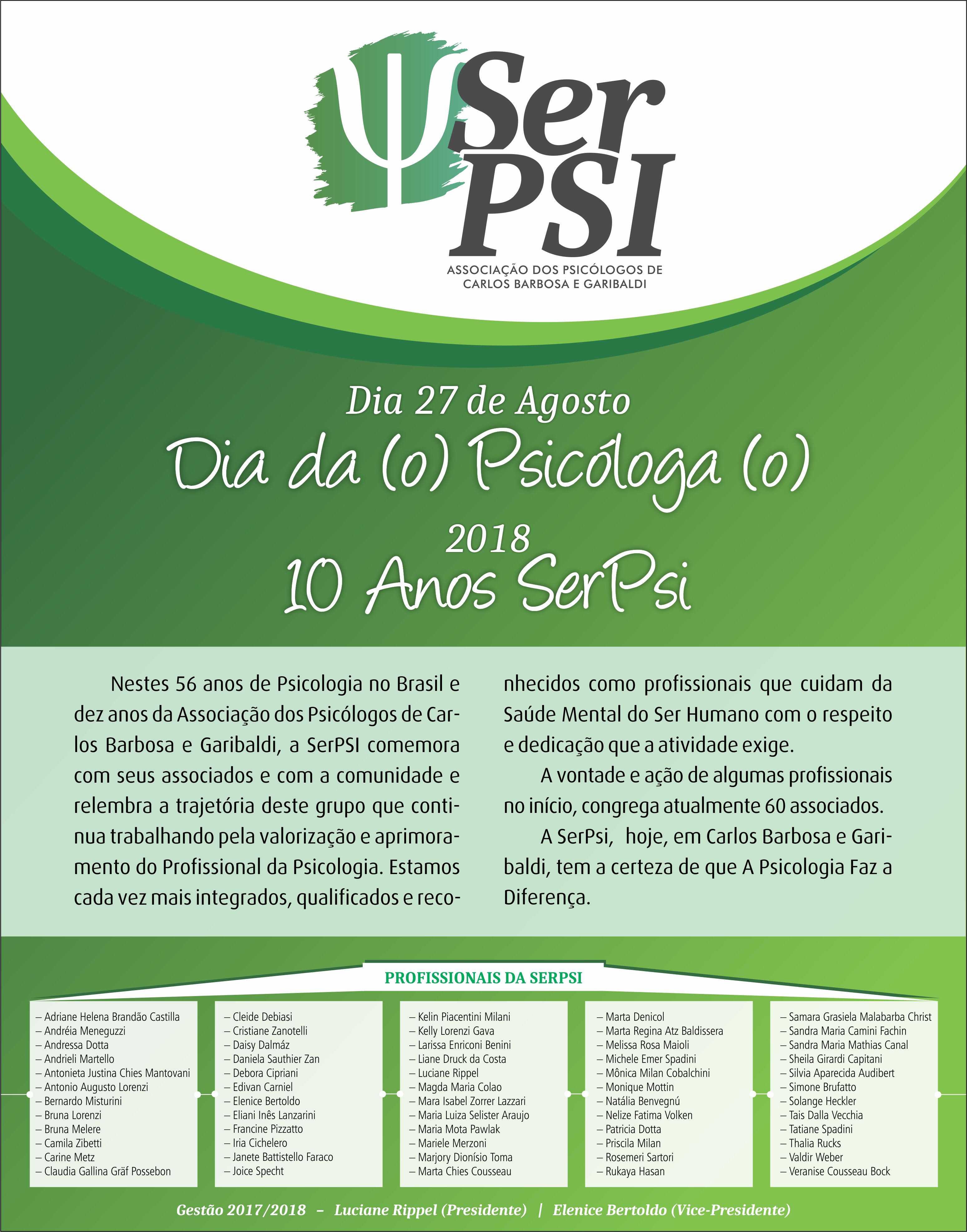 Novamente a SerPSI esteve participando da Campanha Janeiro Branco. Neste ano os sócios da Associação, juntamente com representantes da comunidade divulgaram a campanha, pelo centro e pelos comércios locais, nas cidades...